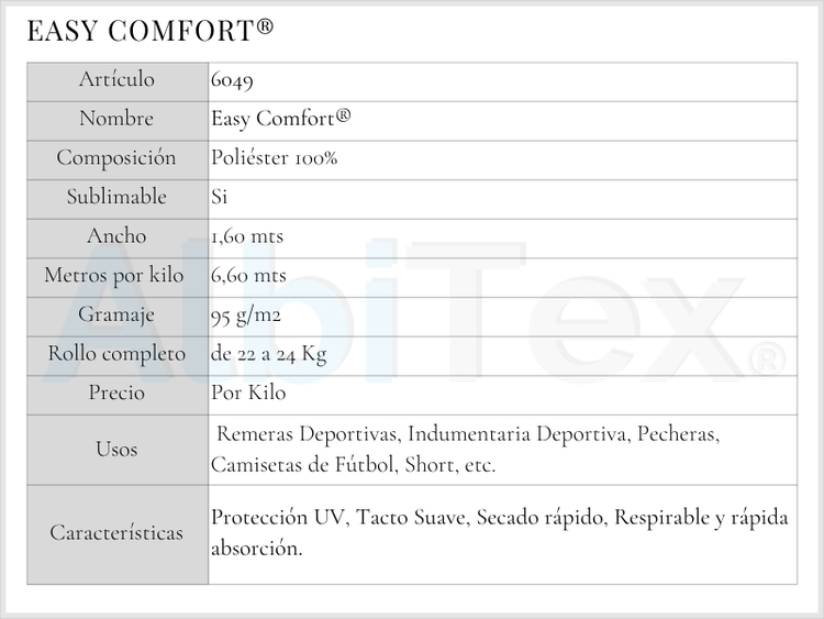 Easy Comfort® es un tejido pensado para prendas que combinan practicidad, frescura y suavidad al tacto. Su estructura súper ligera y funcional lo convierte en la elección ideal para indumentaria deportiva y prendas que buscan ofrecer comodidad premium.