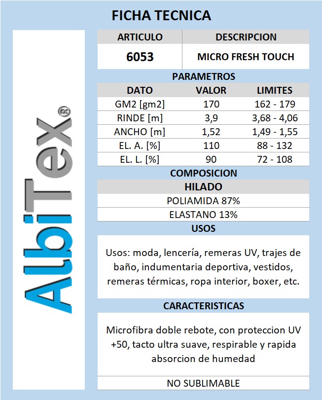 Micro Fresh Touch es la elección ideal para quienes buscan tecnología en poliamida (nylon) con elastano y frescura en cada uso, liviana y confortable al contacto con la piel. Se destaca por su tacto frío y sedoso, logrando una sensación inmediata de alivio incluso en uso intenso o altas temperaturas.