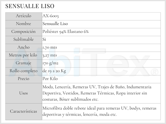 Su versatilidad es incomparable, siendo la opción ideal para la confección de prendas térmicas, remeras UV, indumentaria deportiva, bóxers y más. La capacidad de Sensualle para ser sublimada añade un elemento de personalización que trasciende las expectativas.